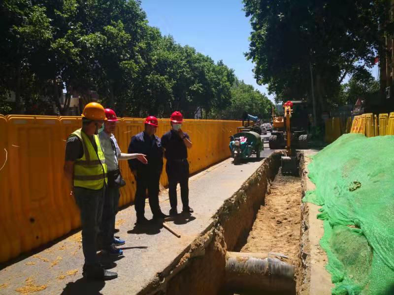 施工前期,為了保障沿途各交叉管線的線路安全,采取了全線高水馬圍擋全封閉式施工,邀請各交叉管線的產(chǎn)權(quán)單位到施工現(xiàn)場溝通協(xié)調(diào),并遵循安全文明施工與環(huán)境保護(hù)的要求,與各施工隊伍簽訂“2021年‘冬病夏治’計劃施工安全保證協(xié)議書”。期間,安排專人對施工現(xiàn)場的圍擋支護(hù)、溝槽開挖、防揚(yáng)塵措施、工具擺放等方面進(jìn)行全方位、全時段、全覆蓋的巡查,緊抓問責(zé)不放松。同時,對施工現(xiàn)場進(jìn)行組織調(diào)度,使各項改造工作有序銜接、穩(wěn)步推進(jìn)。